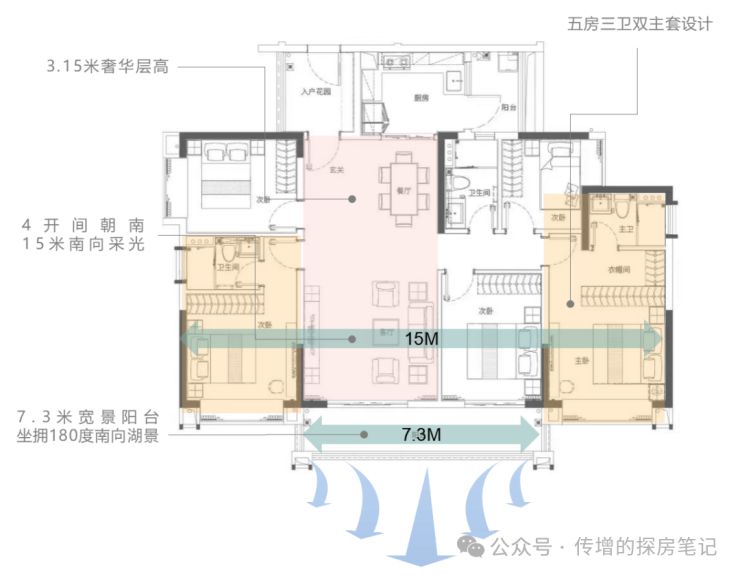 建面约100㎡瞰景大三房,约7.3米超宽阳台,以宽阔的光照面,大幅度迎入阳光,湖园美景尽收眼底。而南向主卧,尊享独立明卫,以超大观景飘窗,自成一方私密天地 ,每天惬意享受清风与阳光。