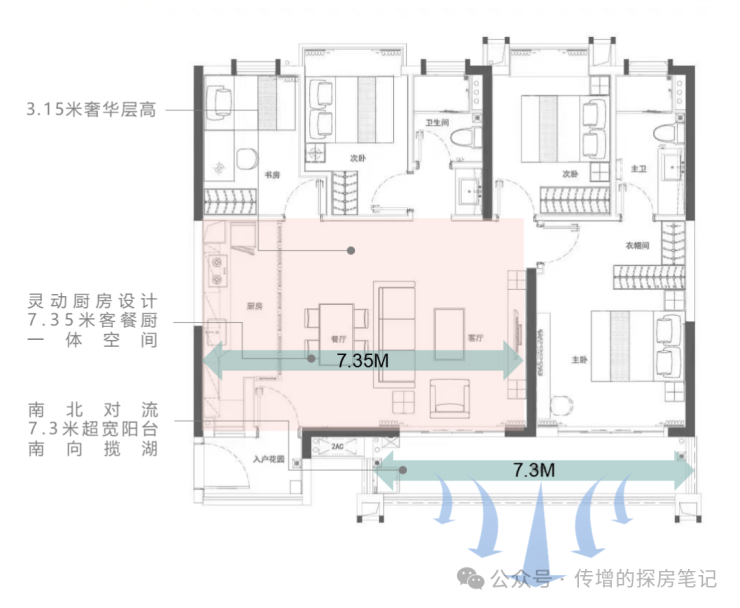 户型整体南北对流,城芯难得的3.15米奢适层高,大气自然,视觉空间明朗开阔。搭配入户花园,带来更舒适健康的生活空间。