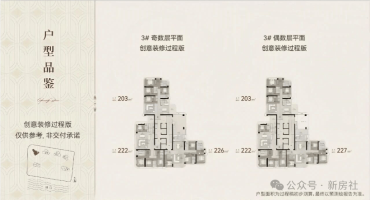226/227㎡户型特点: 4T3户,均有独立电梯及门厅互不扰; ·8*8.4m大方厅,宽敞大气; ·超款客厅落地景观面,客厅、阳台、众数套房可望 江望琶洲总部及广州塔,景观优势(无主阳台); ·有独立工人房但无赠送平台; ·主卧270°景观转角飘窗,800mm飘窗可打;
