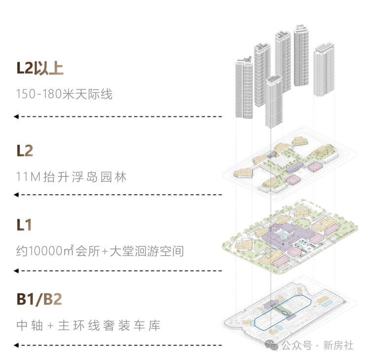第三:重构生活场景。浮岛不是“空中花园”,而是“垂直殿堂”:L1层是10000㎡的会所,能容纳商务接待、健身娱乐、亲子互动;