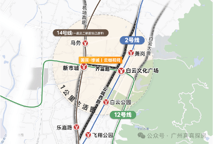 地铁2号线、 12 号线白云文化广场站400米左右,距离14号线二期新市墟站约800米,贯通白云、越秀、海珠等区域。由于紧挨市中心,自驾到天河、越秀也不会太远。通过齐富路、云城东路可快速接驳机场高速、环城高速,10分钟可达机场高速入口,30分钟左右直达天河CBD。