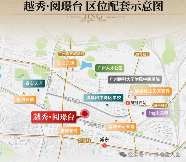 核心优势:项目距地铁21号线棠东站约1.5公里,规划中的地铁19号线智谷西站将在地块附近设站;配建幼儿园,业主子女可由广东实验中学天河学校(九年一贯制)统筹安排学位,同时可参与清华附中湾区学校摇号;周边有ING未来印商业体(已引入盒马、星巴克等品牌)、广州医科大学附属中医医院天河院区(三甲医院);紧邻车陂涌湿地公园、天河人才公园等生态资源。