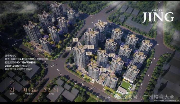 越秀阅璟台位于广州天河区广棠片区,由越秀地产开发,是天河核心区的低密改善型住宅项目。项目总占地约7.95万㎡,总建面约11.16万㎡,容积率仅2.1,绿化率35%,规划21栋住宅(15栋板楼+6栋塔楼),共约1231户,产权70年,精装交付,物业费5.27元/㎡/月,预计2027年交房。