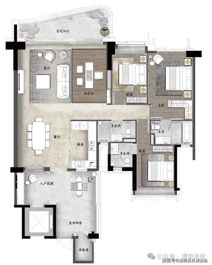 其中,两叠的上叠面积为392㎡,花园面积区间约为123-298㎡,天台面积约为93㎡,实用率193-259%;