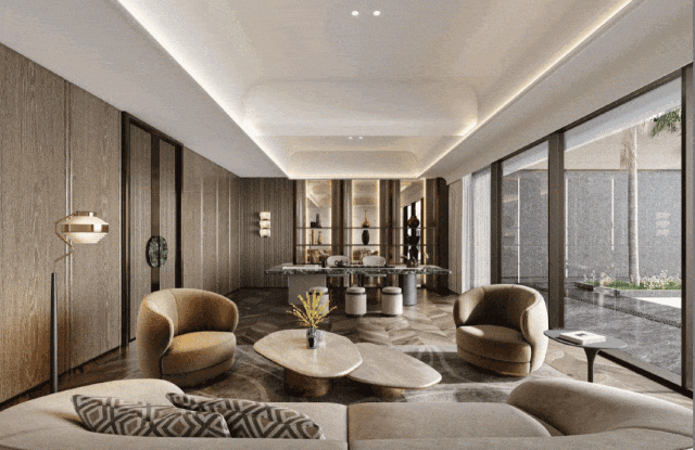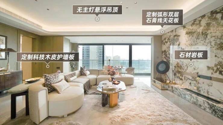 精工细节:全屋高定交付(如6万元级浴缸、岩板台面、全吊顶设计),外立面采用Low-E玻璃+蜂窝铝板,30年不褪色