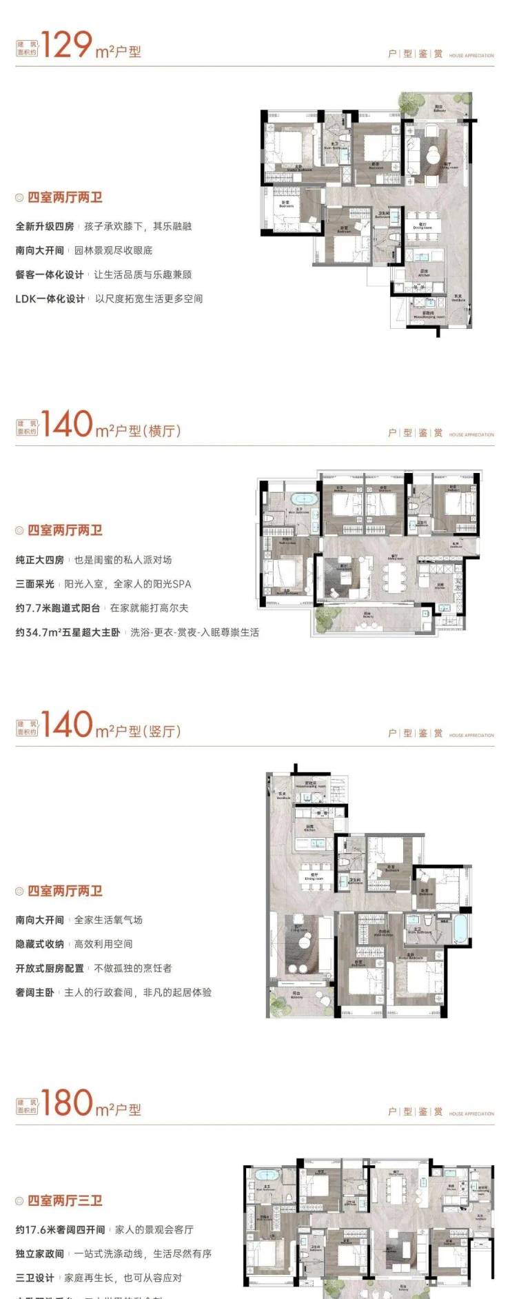 产品迭代期,打磨顶奢质感。项目迭代出129-180㎡多元户型,涵盖三房至四房,92%超高使用率,适配改善家庭[2][6]。采用全玻璃幕墙外立面,3.1米层高、40%绿化率,打造新中式“一轴三园”园林,全屋精装交付,配备德格五件套、大金中央空调,细节拉满[2][6]。140㎡四房最受追捧,南北双阳台,适配三代同堂[2]。