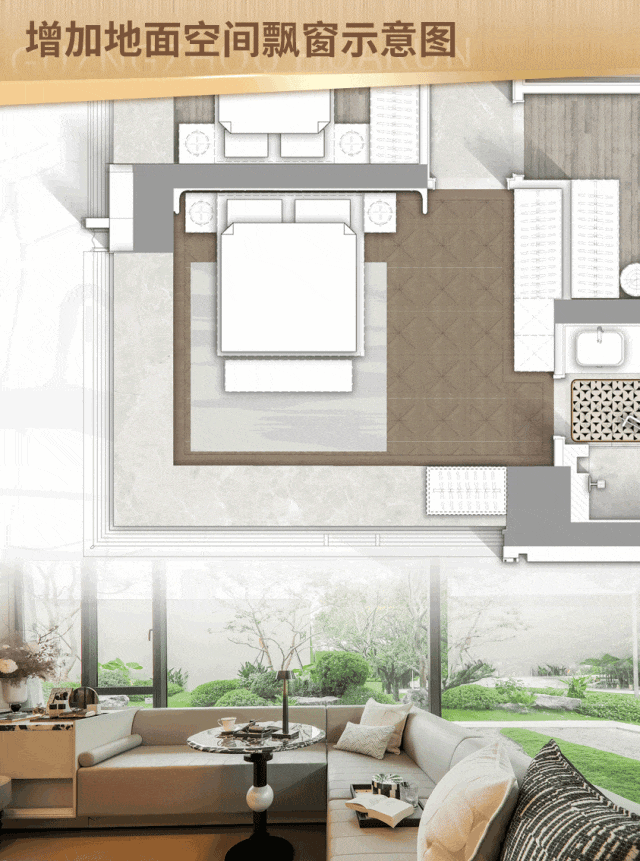 三个卧室均可以直望中心园林,配备大面宽飘窗,几乎要把窗外的绿意都搬进屋内。