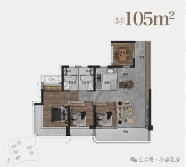 105㎡四房两卫是刚改家庭的热门选择,户型方正,做到了四开间大面宽,采光充足。这个户型空间布局灵活,其中一个房间可以改成书房或儿童游乐区,满足不同阶段的家庭需求。厨房操作空间充足,卫生间做了干湿分离,细节设计贴合日常使用习惯。目前总价在497万到582万之间,单价约4.7万/㎡起,对比同板块同面积段房源很有竞争力。