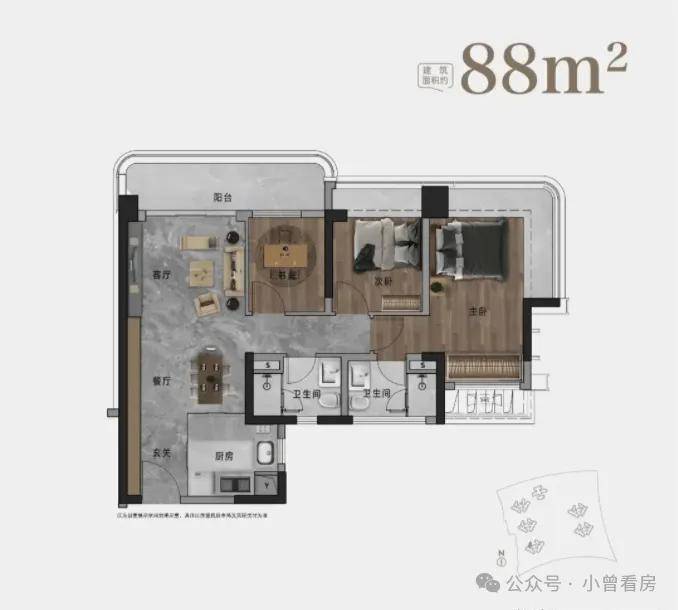 最受刚需关注的是88㎡三房两卫,采用新规设计,实用率很高,做到了3房2厅2卫的格局,就算和老人同住也不局促。客厅4米开间,搭配LDKB一体化设计,餐客厨连在一起,朋友聚餐也不拥挤。主卧带有270°弧形飘窗,还预留了衣柜位置,总价300万出头就能拿下,部分一口价单位性价比更突出。
