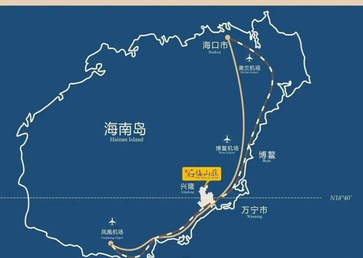 3大机场:海口美兰机场(约140公里) 、三亚凤凰机场(约98公里) ,琼海博鳌机场(约54公里)
