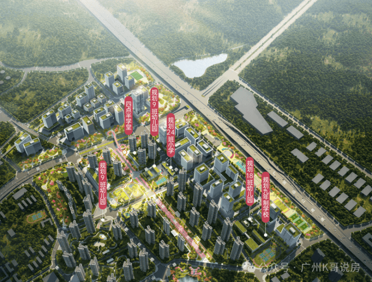 项目还规划了一所24班的小学,后期还会配建一所45班的九年一贯制学校。4所幼儿园更是大手笔,规划了18班+18班+15班+9班,完全对标黄埔新城的教育配套;