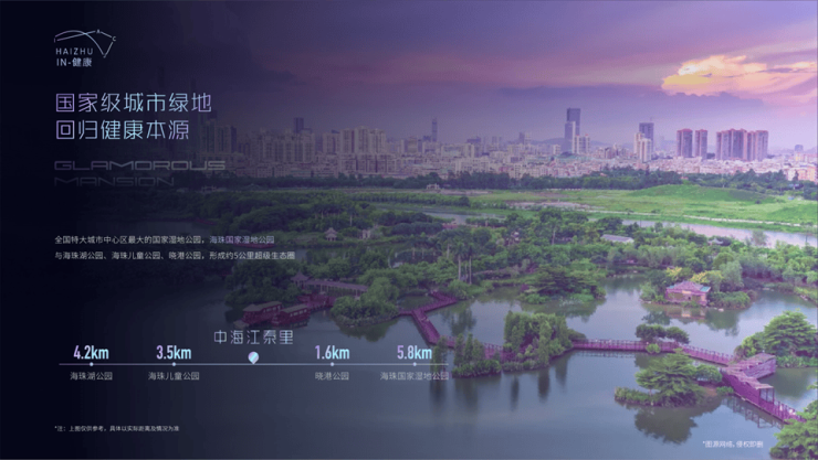 拥有国家级城市绿地自然资源:被全国特大城市中心区最大的国家湿地公园——海珠国家湿地公园,与海珠湖公园、海珠儿童公园、晓港公园,拥有5公里的超级生态圈。