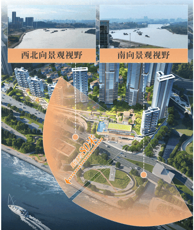 江玥上城所在地块,距离江的距离,最短距离仅约80米!