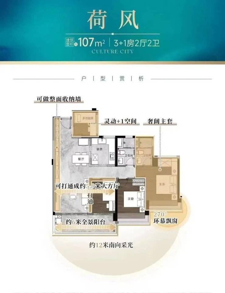 建面约107㎡的四房,拥有12米南向采光面,通透LDK一体化、约6米奢阔阳台,且带有独立入户花园。