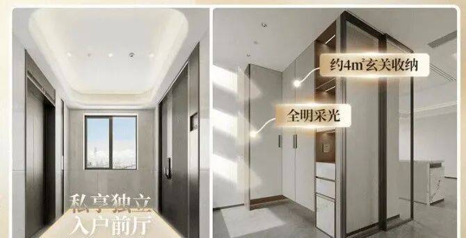 除了专属独立电梯厅,室内还打造有约4㎡的入户鞋帽间,形成“内外双玄关”的设计。