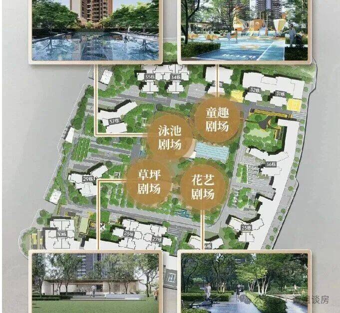 社区配有约10万㎡社区绿色园林,五六期约5.2万㎡央景园林、 内拥近600㎡蔚蓝泳池、超2500㎡全龄游乐园、六大主题花园等生活领地。