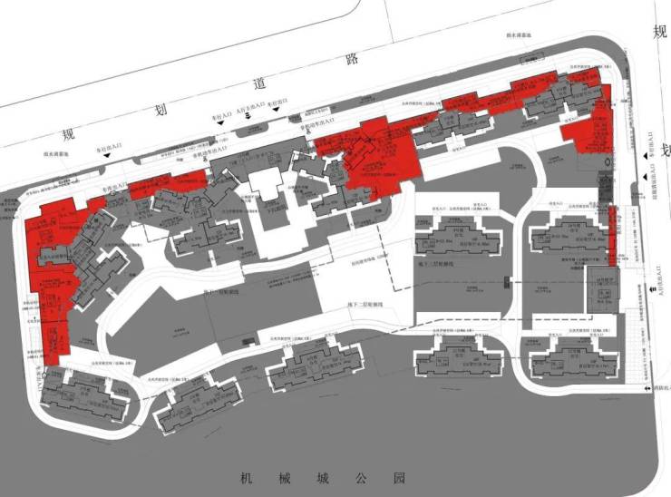 项目南侧和西侧规划了与小区体量相当的公园绿地(机械城公园)。其中,西侧临开发大道绿地带宽约80米,南侧机械城公园300米*100米。由此形成一道绿色屏障,对于前排小高层板楼,可以有效降噪降尘,也拉开楼距,提升了视野景观质量。