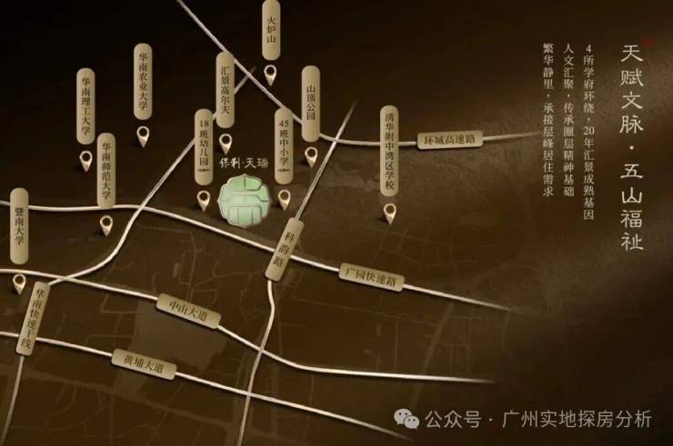 此项目坐落于天河区五山汇景新城,周边环绕着珠江新城与琶洲金融城这两大中心轴线,享有极其核心的地理位置。背后便是汇景板块历经二十年发展所积淀的醇熟配套设施,以及新中式风格的园林景观,为居民提供了优越的生活环境与独特的审美享受。