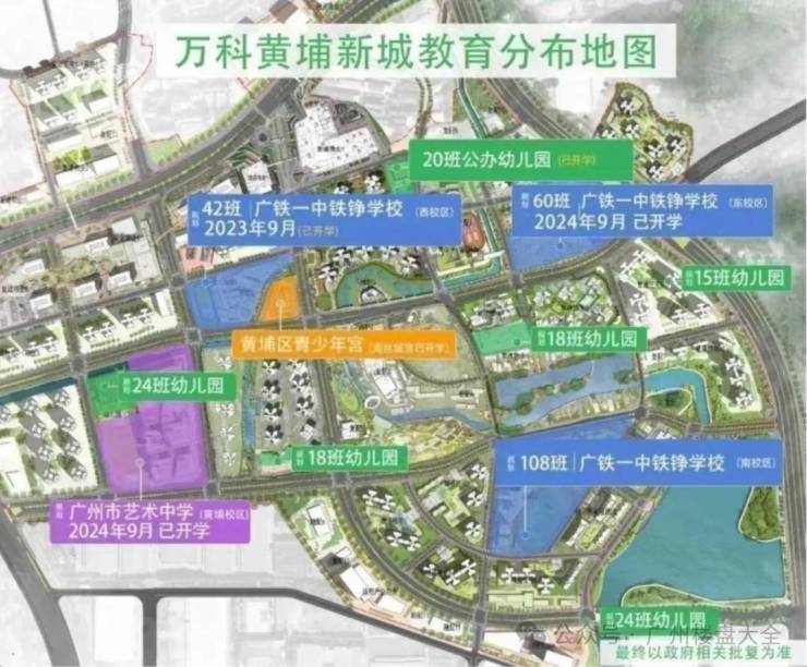 3、教育:万科黄埔新城规划建设11所学校,含6所幼儿园、2所小学、2所九年一贯制学校、1所高中,实现15年一站式教育。截止2024年9月,已经开学的学校一共有5所: