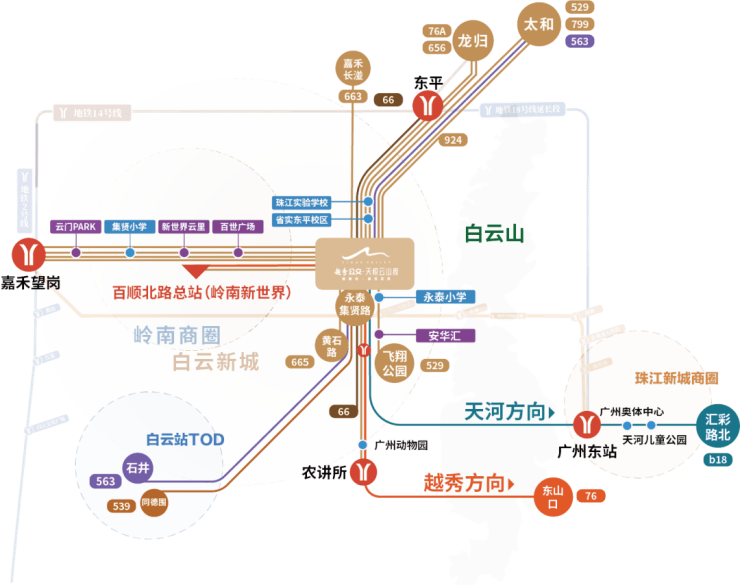 (2)白云东平接驳枢纽:14号线/规划中18号线北延段,经京溪路、广州东站、2站快速直达珠江新城;
