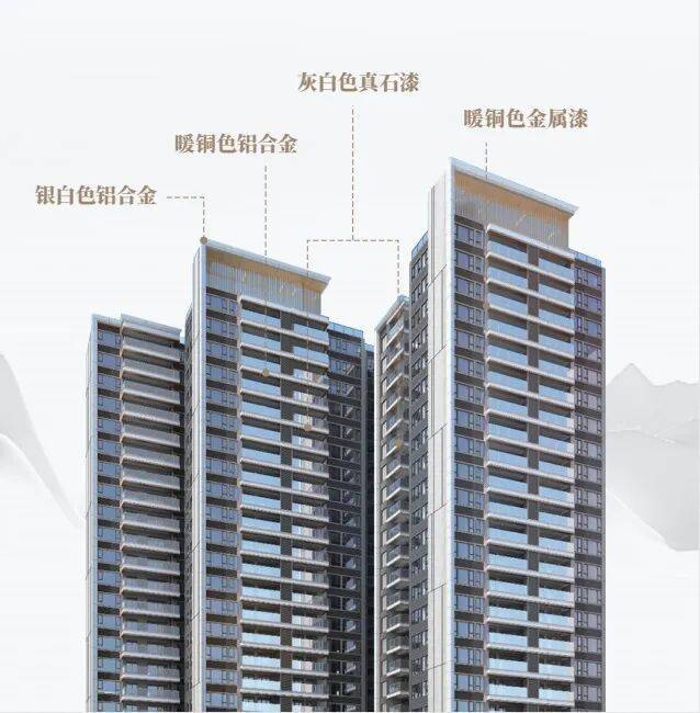 灰白色真石漆+玻璃幕墙的组合,细节处点缀暖铜色,呈现视觉上的美感与质感;楼冠格栅的疏密变化,折线造型设计宛如倒立的山峦形状,呼应远处的白云山轮廓线