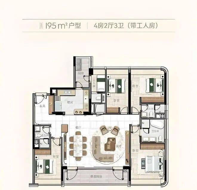 195㎡四房更宽敞,客厅餐厅连在一起,过年亲戚来聚餐都不挤;每个房间都不小,孩子有自己的学习空间,老人住着也舒服。