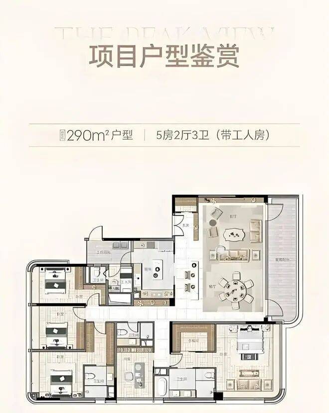 290㎡五房直接是 “壕” 配置,大阳台能摆躺椅晒太阳,主卧像个小套房,有书房有衣帽间,在家办公都超有仪式感。