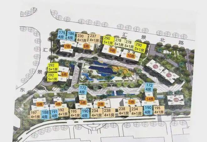 项目由14栋12层小高层组成,产品涵盖123-352㎡三至五房,共8类户型,户型实用率约82-84%