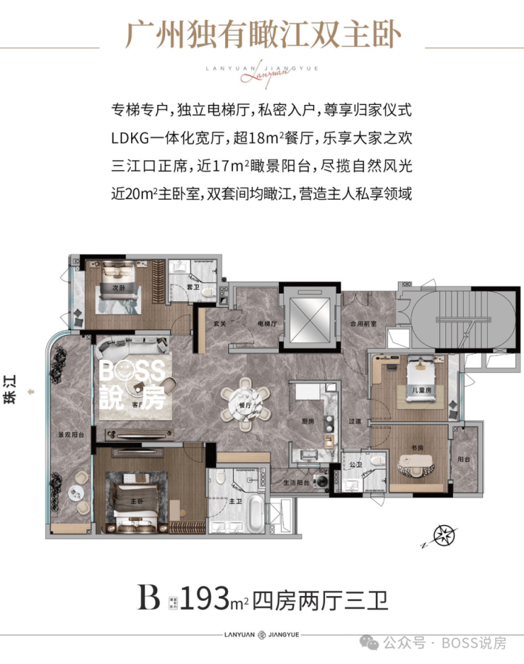 户型优越:只做了 193㎡和 285㎡两种江景大平层户型,设计了专梯入户、LDKG 大宽厅、望江双主套、保姆间等,功能分区合理,空间尺度感十足。如 285㎡户型的会客厅面积约 60㎡,并配有大面积玻璃,采光和视野极佳,还有弧形的转角阳台,可 270 度俯瞰江景。