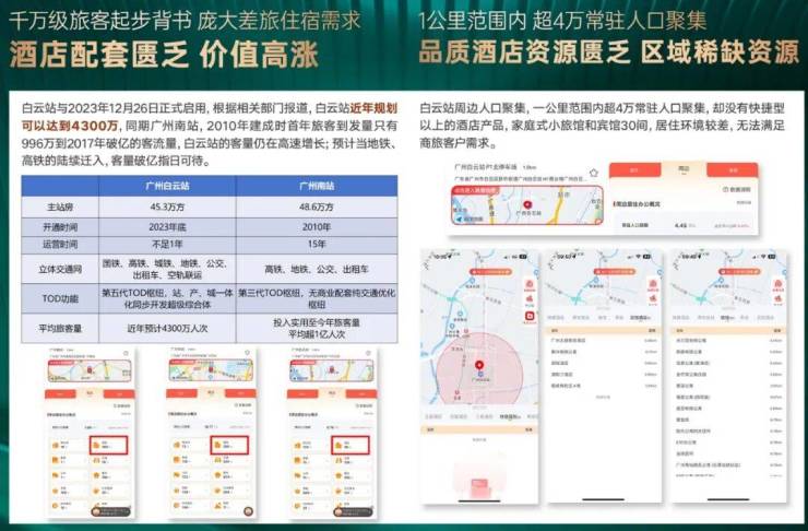 广州各大交通枢纽周边酒店常年满租,白云站作为新核心,周边1公里内酒店稀缺,现有连锁酒店入住率超90%,商旅住宿需求旺盛。