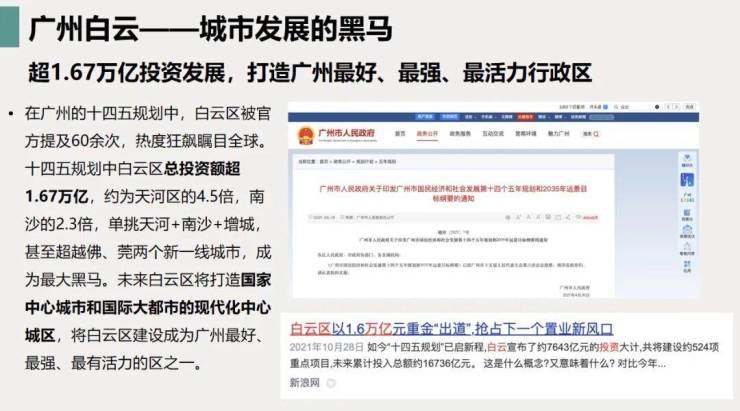 周边布局“白云新城”“白云湖数字科技城”“广州设计之都”“广州时尚之都”“广州西岸科创园”等重要平台,聚焦引进6大千亿级产业集群与6大百亿级高新技术企业,加速形成具有国际竞争力的现代产业体系。