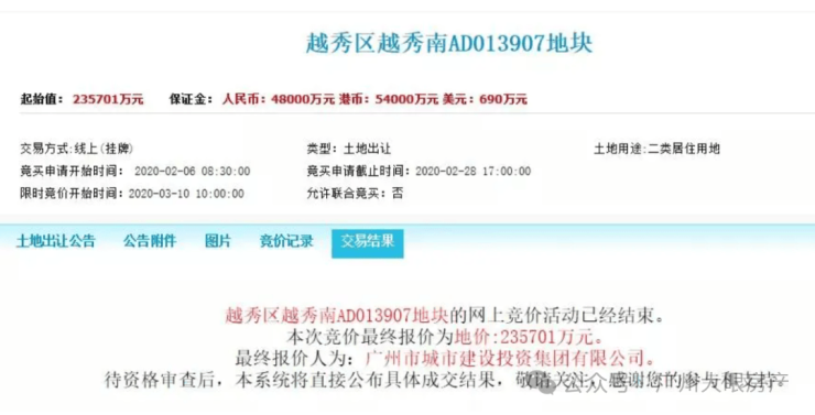 广州城投·东园公馆所在的越秀区越秀南AD013907地块,为2020年3月广州城投以235701万元竞得,扣除1.3万㎡的配建面积后,折合楼面价64576元/㎡。