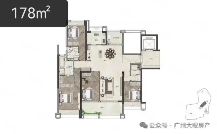 项目不大,一共有4栋,其中,4#为政府规划用房,只有1#、2#、3#对外销售,都是21层小高楼,专梯专户的设计,专属电梯直接入户,归家体验既私密又充满仪式感,除了1栋是五梯五户之外,另外2栋都是四梯四户,产品一共有7个户型,91㎡-178㎡的三至四房为主,总货量仅249套。