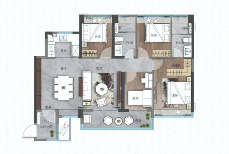 大横厅户型,四开间朝南,不仅体现空间尺度,更保证采光通风和景观视野。