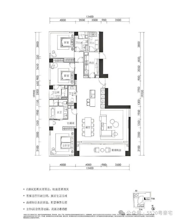 280㎡三房两厅四卫:位于1栋三、四单元24-32层,为05、08户型。拥有超8米超宽幕开间,厅出阳台可直面海景。采用三套房设计,主卧配备L形全景落地窗,占据270°最佳观海位。