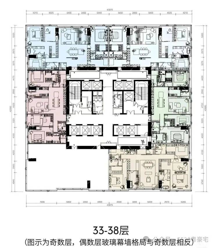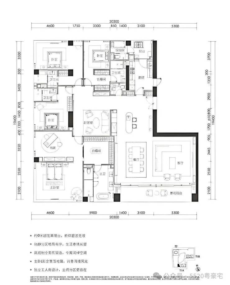 468㎡五房三厅六卫:位于1栋一、二单元高区33-38层,一层一户,仅6席。五房四套房设计,主卧L形全景落地窗,270°最佳观海位,南向超大三厅一体,动静分区布局有序。