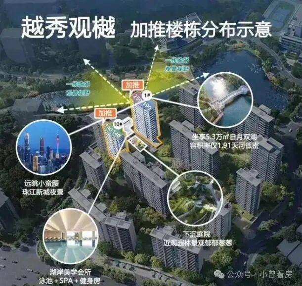 从项目基本情况来看,越秀观樾总占地面积约 20.64 万平方米,总建筑面积 25.1 万平方米,规划了 25 栋住宅楼,分北地块 5 栋、南地块 20 栋布局,一期共约 760 户。小区容积率仅 1.91,在天河核心区属于偏低的水平,绿化率 35%,车位配比达到 1:2.15,能充分满足多车家庭的停车需求。