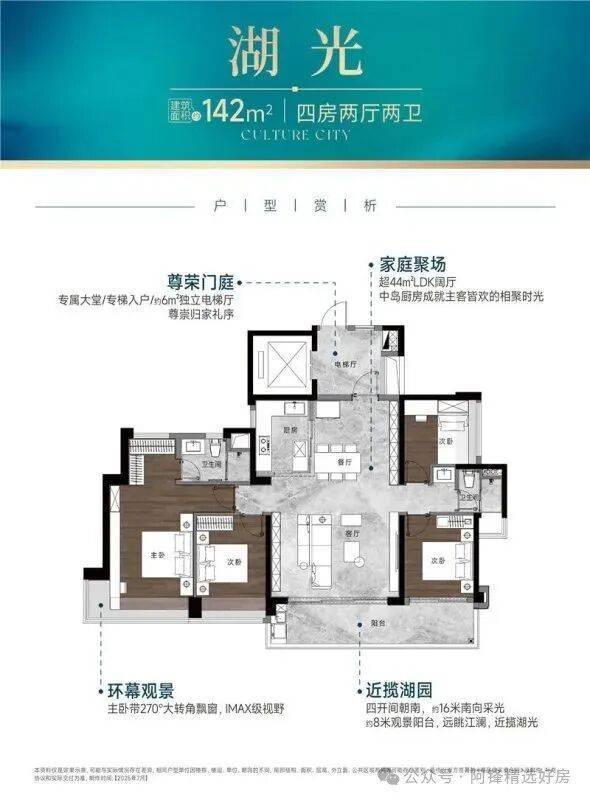 建面约142㎡的四房,做到约16米南向采光,站在约8米全景阳台,约1.2万㎡湖景扑面而来,高层还能望江。