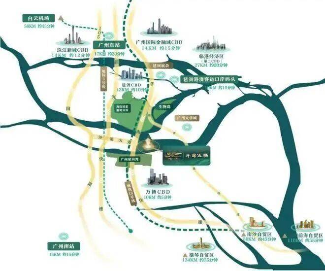 道路交通:项目周边有南沙港快速、华南快速、新光快速等城市主干道,15分钟可达万博商务区,30分钟内直达珠江新城