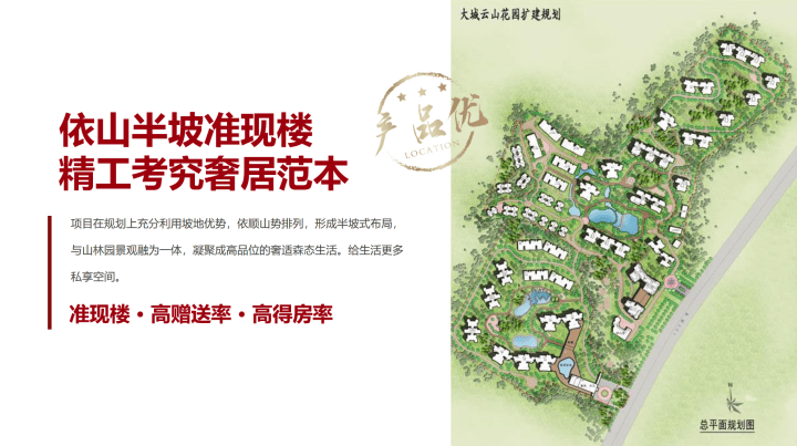 大城云山整个社区呈葫芦状,三面环山聚宝盆格局,置身于超4000亩北回归线森林公园里,植物资源极为丰富,公园内所有测点负离子浓度都在1500个/㎡以上,公园内空气清洁度达到最清洁的A级,典型的低密度住宅,整个建筑依山而建,顺山而居,形成融于自然山水的生活社区——真正公园里的家