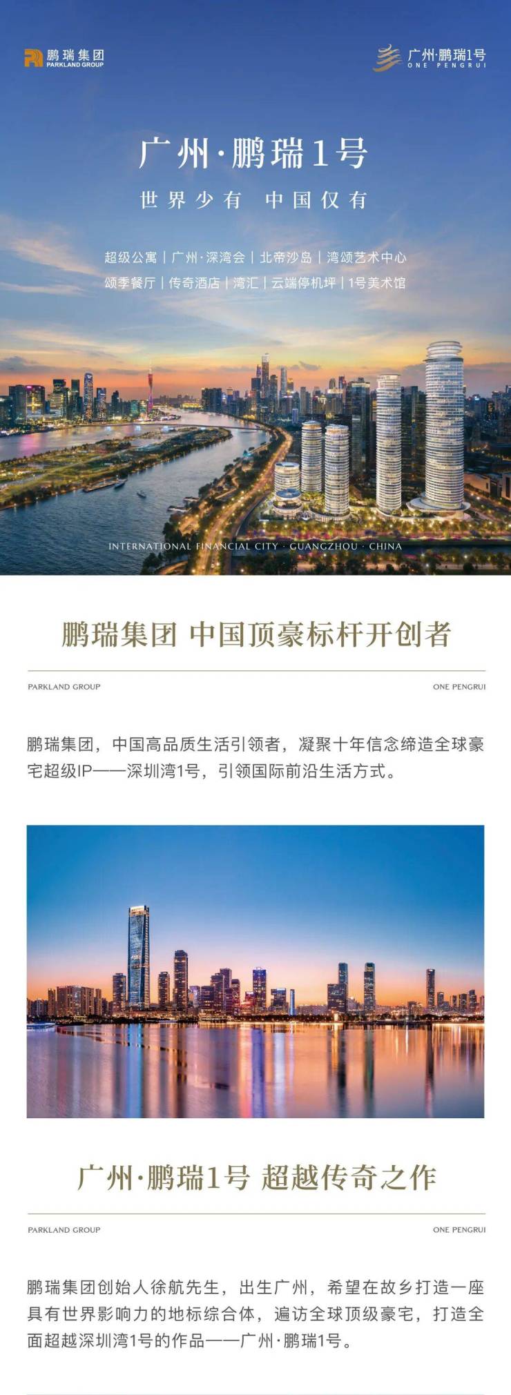 广州鹏瑞 1 号是鹏瑞集团继深圳湾 1 号后,以 “全面超越自我” 理念打造的 “中国仅有、世界少有” 全球影响力地标综合体。作为创始人徐航先生献给故乡广州的百年建筑作品,其定位 “服务全球企业的广州会客厅”,对标纽约 220 Central Park South、东京 Aman Residences 等国际顶豪,重新定义粤港澳大湾区顶奢生活标准。2023 年,项目斩获世界高层建筑与都市人居学会 CTBUH 全球未来奖,印证其建筑领域的国际认可度。