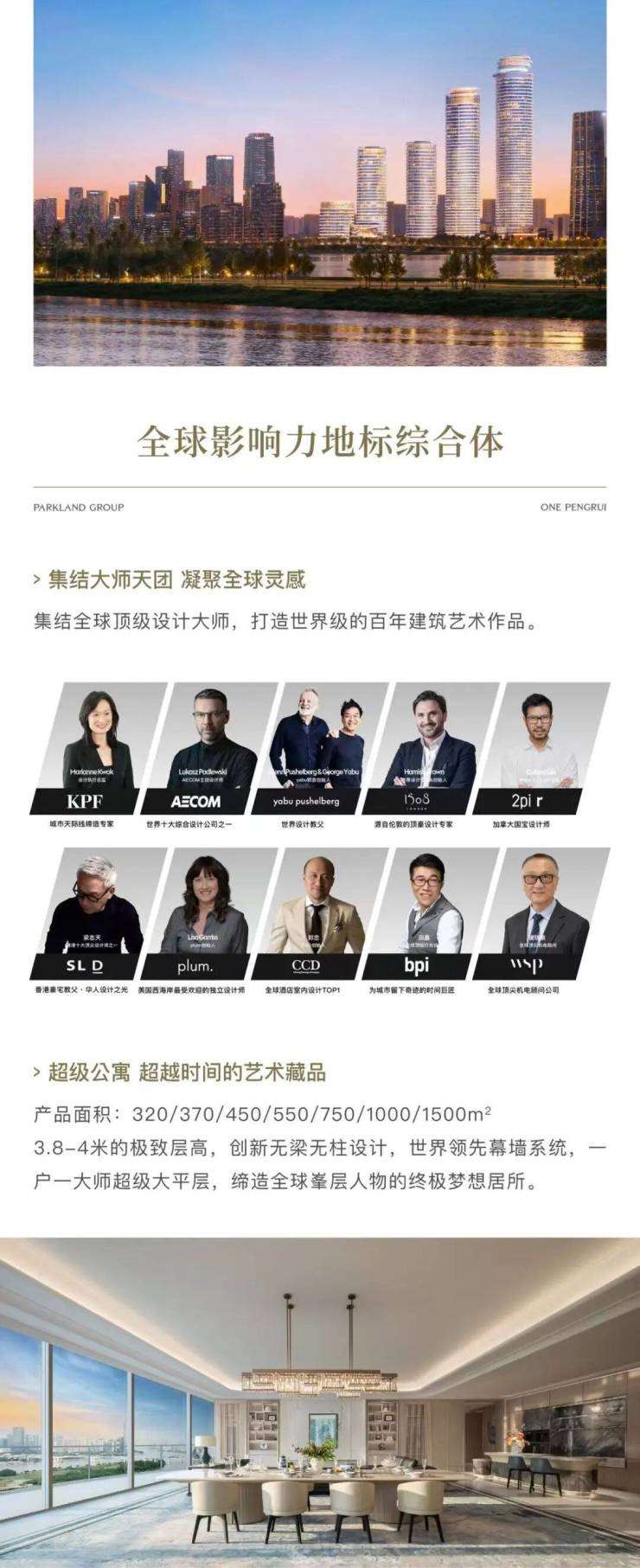 项目集结全球顶尖团队打造:建筑设计由 “城市天际线缔造者” 美国 KPF 操刀,以珠江水纹为灵感,创造中国首个弧形外立面超高层建筑群,诠释 “天圆地方” 传统哲学;景观设计由美国 AECOM 打造双层星空园林,包含 500 米香樟大道与 1000㎡锦鲤池;室内设计汇聚 Yabu Pushelberg、梁志天等大师,搭配英国 1508 LONDON 等豪宅专家团队。施工上采用 1500 吨双曲面铸铝外立面、三层夹胶中空超白玻璃及飞机舱式密闭阳台门,隔音隔热性能行业领先。