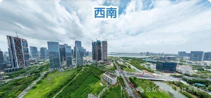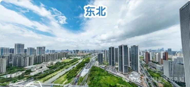 西南与东北:楼下近距是公园绿地和双界河东段景观,远处看新安老城方向与整体前海城市景观,远处海景为主。