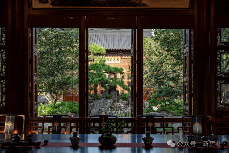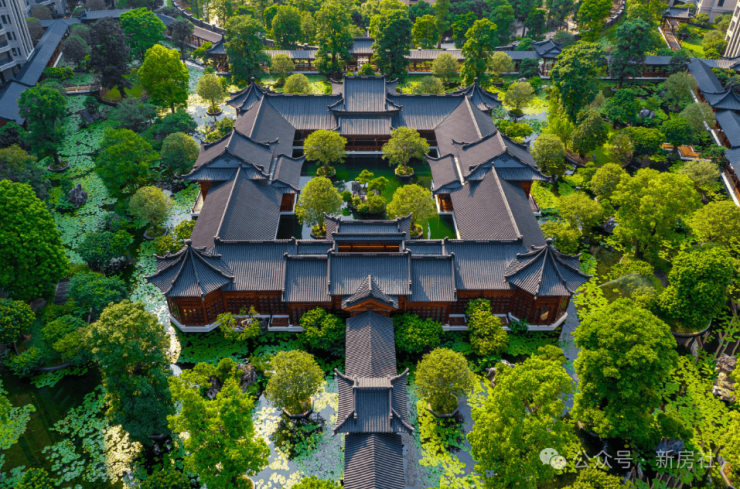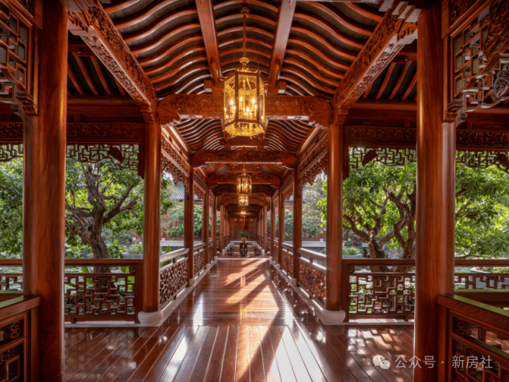 融合晋派大气与徽派精巧,千米风雨连廊串联 21 座亭台廊轩,600 余棵百年名树全冠移植,96 块匾额楹联取材唐诗宋词。