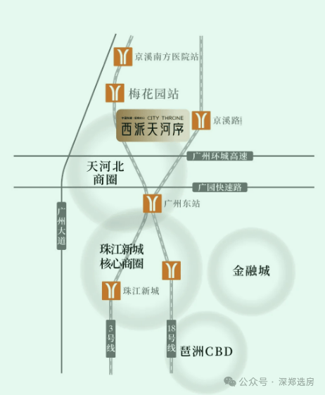 西派天河序位于天河区北部后天河北块,占位中轴北段,从珠江新城出发,驾车15分钟就能到达。步行距离约400米到达地铁3号线梅花园站,5站即达珠江新城CBD。