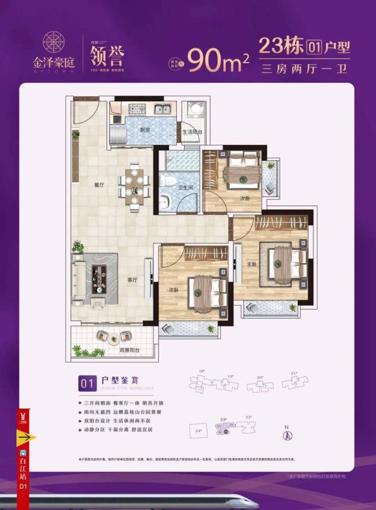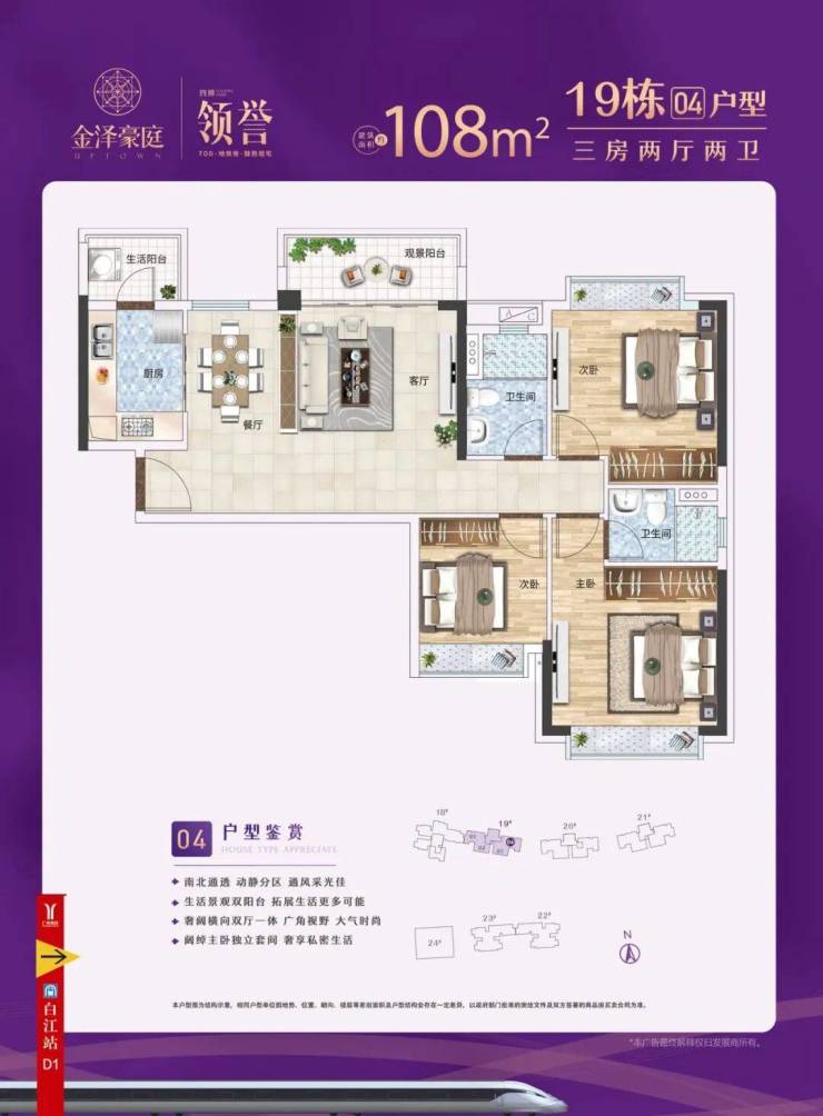 建面约 108㎡三房两厅两卫:户型方正通透,四开间朝东南,全明格局,采光通风效果极佳。客厅开间约 3.9 米,连接约 6.5 米超大阔景阳台,推窗即揽半山绿意与城市盛景,无论是休闲品茶还是家庭聚会,皆有充足空间。主卧为套房设计,配备独立卫生间与全景飘窗,私密性与舒适度兼具;两间次卧空间宽敞,可作为儿童房、老人房或书房,满足多元使用需求。厨房为 U 型设计,操作动线流畅,洗切炒煮一气呵成;双卫设计,干湿分离,避免早高峰使用冲突,兼顾实用性与便捷性,是三口之家或刚需改善的理想选择。