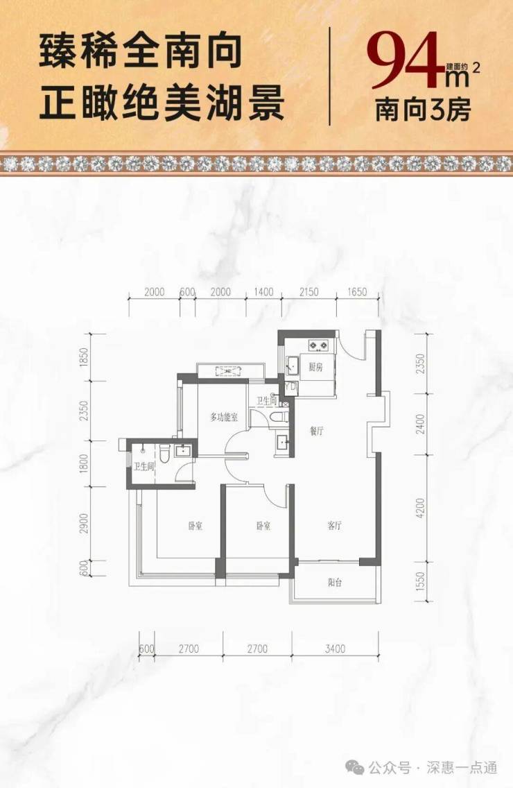 94㎡的3房2厅2卫,设计的是经典竖厅格局,客厅3.4米开间,LDKB一体化,S墙设计预留冰箱卡槽位,动静分区,三开间朝南,分别做到了主卧13.55㎡/次卧9.45㎡/次卧7.28㎡(包含墙体飘窗),U型厨房,公卫三段式干湿分离,得房率约74%(不含赠送),阳台东南朝向约5.27平。套内面积69.94㎡+赠送面积9.65㎡=实得面积79.59㎡,加上赠送后得房率约84.22%。