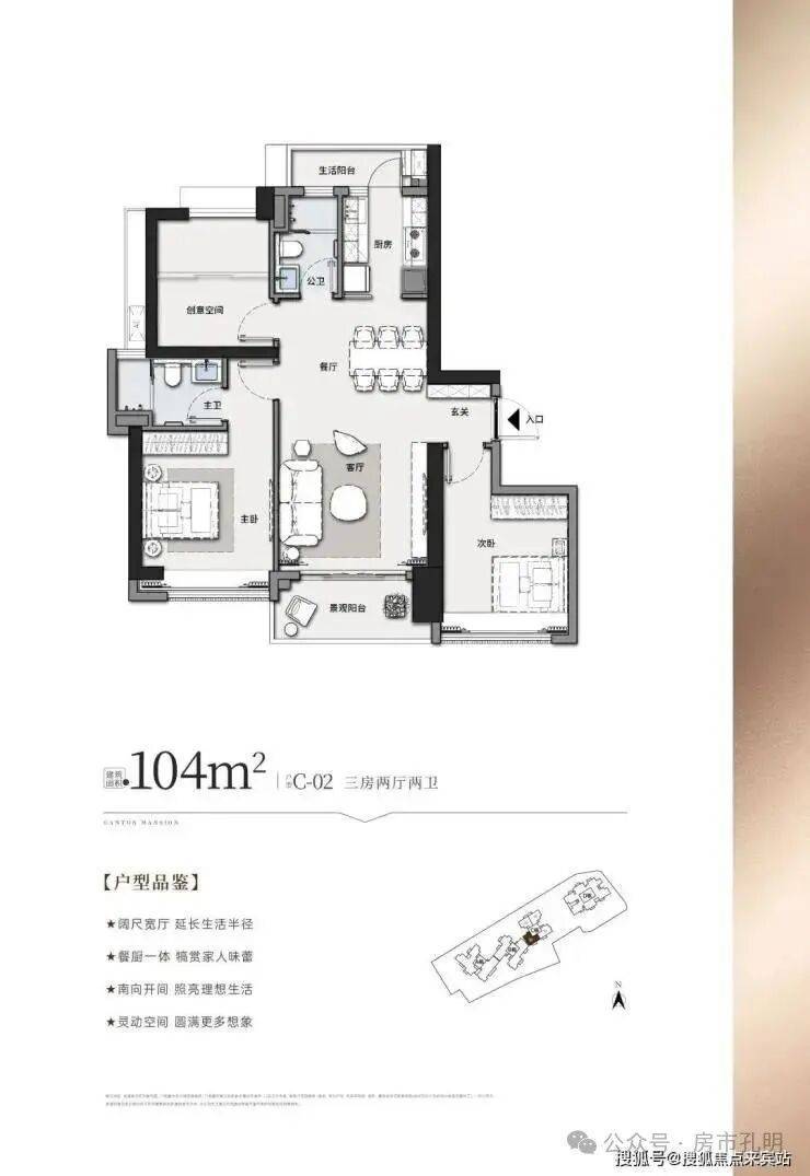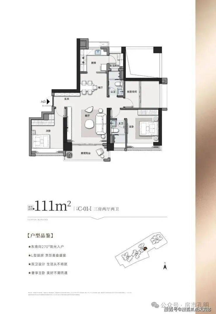 建面约111㎡三房两厅两卫精致3房设计,南北对流改善一步到位,东南向270°阳光入户,约4.2米景观阳台,约3.5米主卧开间 乐享144方主卧同等朗阔空间