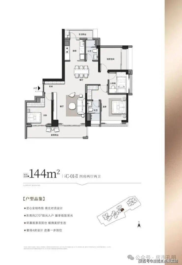 建面约144㎡四房两厅两卫市中心稀缺南北双阳台对流户型,7.5m阔尺阳台,LDK客餐一体化,改善首选,东南向270°阳光入户,四季皆是明朗光景