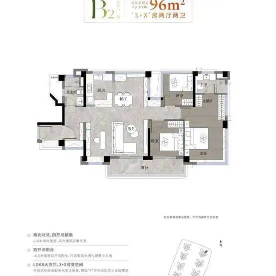 96平方米空间更加舒适,推出的是“真方厅”设计,避免了传统方厅“餐厅小、通道窄、刀把型”问题,还首次在该面积段配置主卫独立衣帽间,尽可能让买家“买96平方米得110平方米”的空间感受。